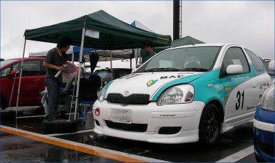 我々ピットクルーは雨の中、朝5時20分には現地パドックに到着しドライ バーを待つ事になった。31号車とピットクルーAは駐車証とクレデンシャ ルカードがあるのでゲートはフリーパスだが私はクレデンシャルカードだけ なので駐車料金600円をゲートで支払う。ドライバー達は目と鼻の先のモ テギ内キャンプ場前泊なのでひとまず安心している。当の本人達は雨音で 朝3時まで寝られなかったそうだ。5時45分には全員集合しチームの陣地 を設営する。他のチームは前日から練習走行に参加してテントやタープな どを張りキッチリ雨対策をしている。回りのチームも段々集まって来る。近 所のチームに挨拶をして今日も宜しくと声を掛けておく。 準備 今日は朝から雨でウエット仕様にショックアブソーバーとタイヤの空気圧を 調整する所だが前回筑波でウエットの時タイヤの空気圧だけセッティング でOKだった車の準備を済ませる。何れショックアブソーバーとスプリングと 空気圧になるだろう。シートベルトを取り付けて(こないだの筑波は取り付 けたままであったけど) ホイールナットの締め付けトルクを確認しエアバッ グのコネクターを外す。その他に外観から確認できる場所の各種ボルトや ナットやビス類の緩みや外れ等が無いか目視や指触点検チェックを行う。 タープの骨に秘書作成の1000ccカップのタイムスケジュールをガムテープ で貼り付ける。これが結構優れもので関係者がしょっちゅう見ていた。 受付 一息ついて時間になりタワー右側建屋ブリーフィングルーム隣にあるイン タビュールームの受付に行き参加受理書とドライバープロフィールを提出 しプログラムと周回計測器を受け取る。車に戻り筑波仕様に変更してある 周回記録装置をモテギ用に変更する。表にスイッチがあると便利だが外し て裏蓋を開けて切り替える。 車検 車検時間になり車検場へ車を移動し車とウエアとライセンスなどのチェック を受ける。車の方が先に車検場に進んでしまいちょっと待っててと車の方 に声を掛ける。車以外の検査が済み書類が慌てて車を追いかける。グロ ーブを忘れて大あわてで取りに行き車検員に見せる。今回はタイヤのバラ ンスウエイトのテーピングの指摘を受ける。前回のタイヤはOKだったけど 今回は寸法違いの新品を持ってきたので一部見落としがあった。・・・と言 うことにしておく。パドックに戻りテーピングを施す。タイヤの内側に手が届 かないのでタイヤを外すことにする。その時電動インパクトレンチを使用し たがとても使い勝手の良い物であった。選手はドライバーズブリーフィング に行き、残った我々はメンテナンス関係者とセッティングについて打ち合 わせる。ここに来て近所の速い選手のチームは何となく殺気立っている。 我々の落ち着いた行動?とは対照的だ。他のチームの監督が”追いつい たら抜かせてね”と言ってきたので”どーぞ譲りますので遠慮無く抜いてく ださいね”と言っておく。予選は15分で一周目はゆっくり行くからウチの前 に入っていればよほどの事がない限り追いつくことは計算上あり得ない。 予選 今日モテギを走るのは二度目だがウエットは初めてなので、予選は無理 をせず多少抑え気味に行けと指示を出す。スペアカーを持ってきていない ので尚更だ。(帰れなくなる。)ドライバーズブリーフィングではコース上に 川が二本出来ているから注意せよとメッセージがあった。これに対しては 、またまたタイヤは予備も含めて山がたっぷりある新品を持ってきたので 今日のウエットには最適となる。前回は185-60-14で今回は175-60-14 で近くのチームが予備のタイヤを興味深げに覗いていた。結果は予選通 過基準タイムを31.767秒上回っているので良しとする。走行直後のタイ ヤ前後左右の内中外の温度差を確認する事が出来た。ほぼ期待通りの 結果であった。ドライになったら少し上げる方向で行く。予選は最速タイム の130%以内の112%のタイムを出す事が出来ました。前回の116%か ら4%UPする事が出来ました。このままドライ路面に当てはめれば3分を 0.8秒切っているのでまー良いか。グリッドは14番に決まる。予選結果か ら見ると今回も周回遅れは否めないかなという予想が立つ。決勝までに 時間があるので、次回申込書の見本を説明しながら参加費も含めて説明 する。使用タイヤは今回の物を使用するというので車両申告書内のタイヤ の欄を185から175に書き換える。ここで太陽が出てきてドライ路面とな る。他のチームは車両持ち出しの手続きを取りドライセッティング???? にしているようだ。ウチのチームは空模様を見て空気圧でも調整しようか と言っているうちに雨が降ってきたのでそのままにする。 決勝 決勝前のドライバーズブリーフィングと出走前点検を受け決勝に臨むこと となる。せっかく乾いてきた路面はまたもや完全ウエットになり予選の走 りのまま気をつけて行けと完走目標の指示を出す。車両は一応ウエット仕 様のまま望むことになる